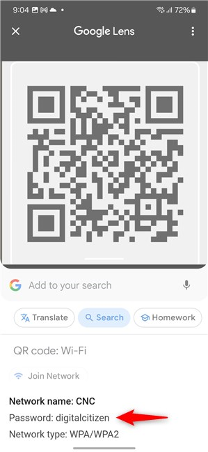 This opens Google Lens. The QR code is analyzed and you can see both the network name and its password at the bottom of the screen, as shown below.