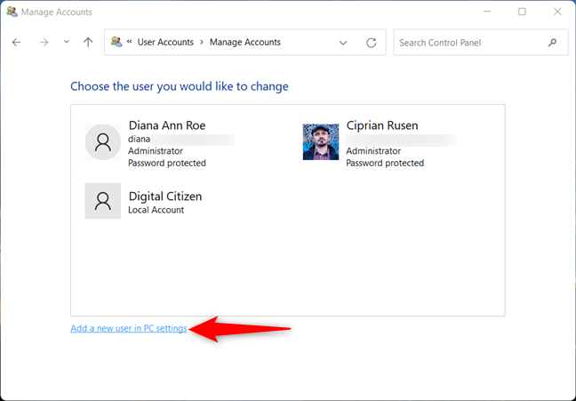 Next, click or tap on the “Add a new user in PC settings” link at the bottom.