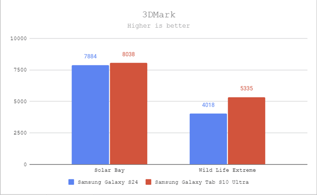 Even though not many people will buy this tablet for gaming, I ran 3DMark anyway, and it's Solar Bay and Wild Life Extreme tests. As you can see below, the Galaxy Tab S10 Ultra performed very well, with excellent results in both tests, proving that this tablet can run games with maximum ease. The only problem is its size, which makes it uncomfortable to hold in your hands when gaming.