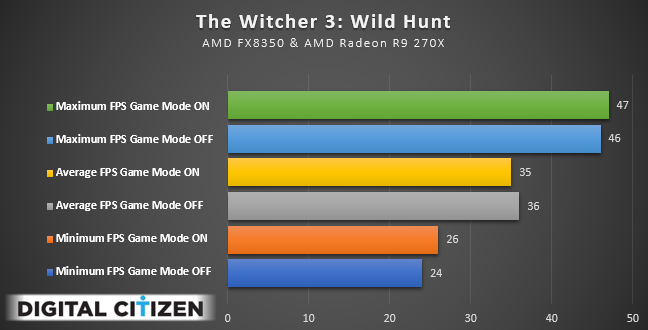 On the second PC we used (AMD FX-8350 & AMD Radeon R9 270X), turning on the Game Mode decreased the maximum number of frames per second. The other statistics remained the same.