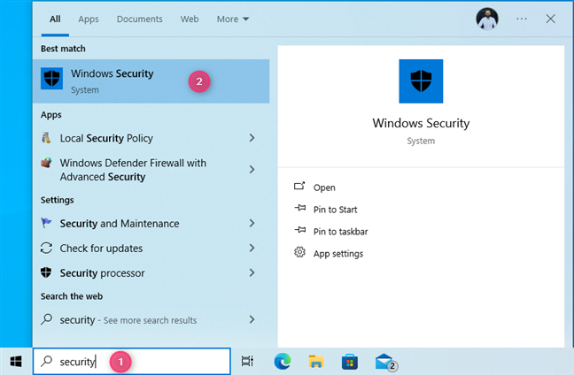 If you're using Windows 10, click or tap inside the Search box on the taskbar, type the word security, and choose the Windows Security search result.