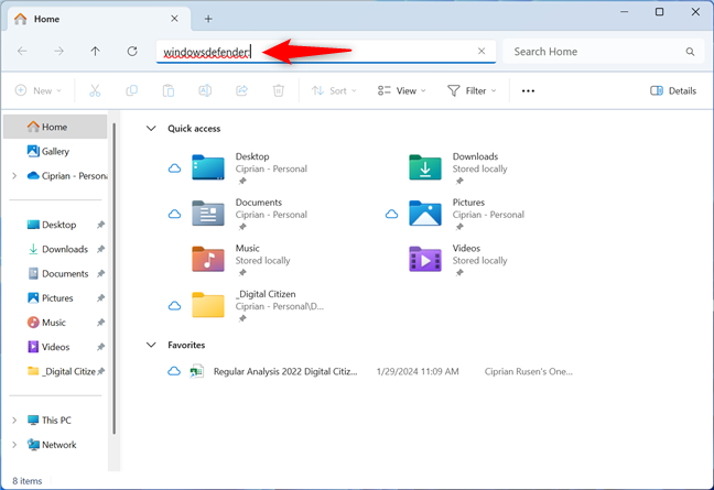 Few people know that File Explorer offers another convenient way to start Windows Security. Open File Explorer and type or copy and paste this command in its address bar: