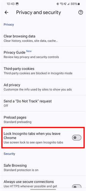 On the Privacy and security screen, tap to enable the “Lock Incognito tabs when you leave Chrome” switch.